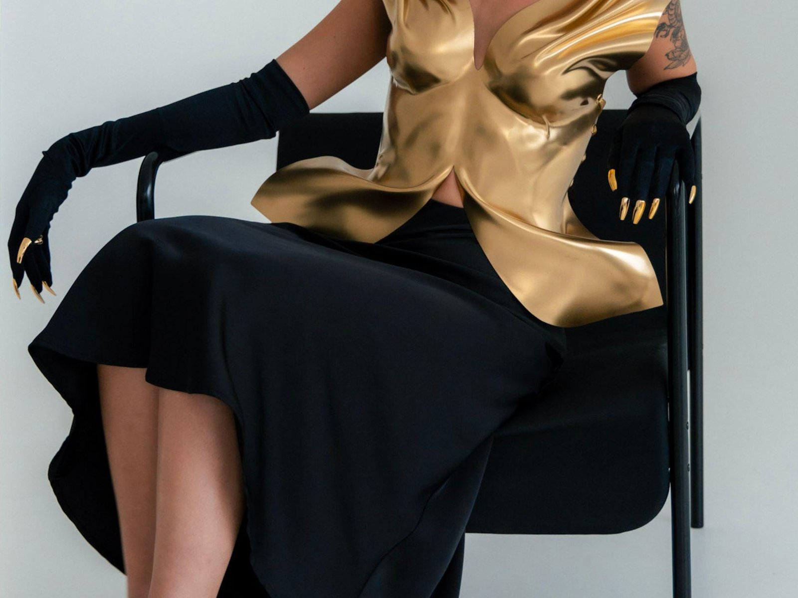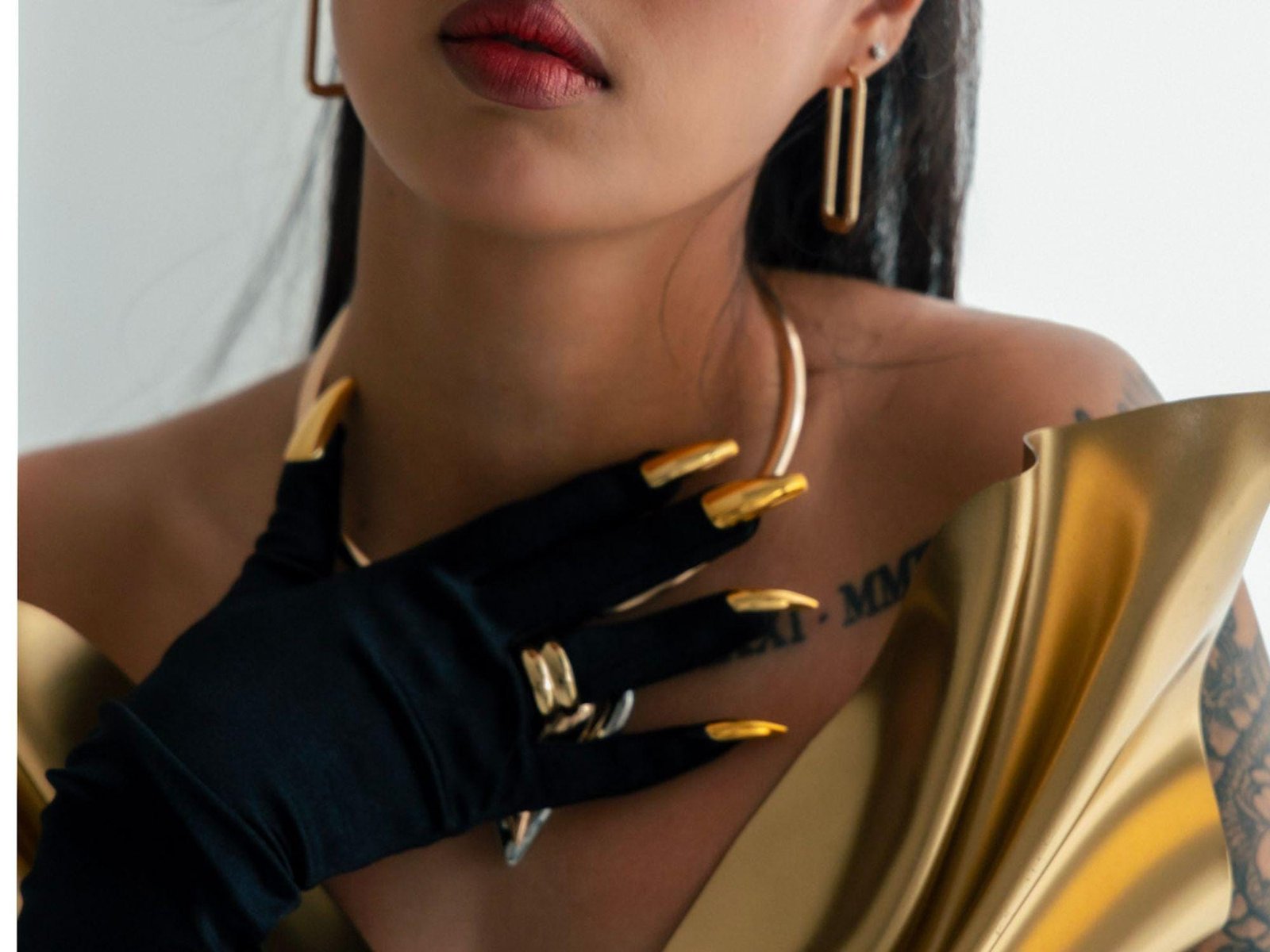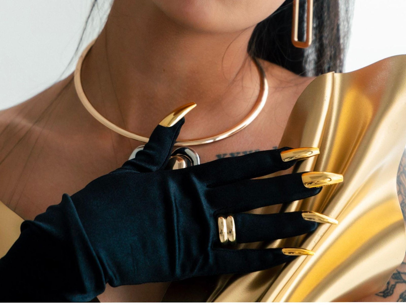 Long Black Gloves With Stunning Gold Silver Metallic Nails Bold Accessory Glamorous Looks Perfect For High-Fashion Events Formal Gloves